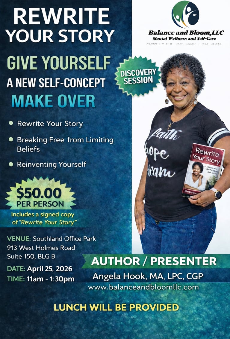 Are you ready to break free from limiting beliefs and step into a renewed version of yourself? Join Angela Hook, MA, LPC, CGP, published author and dynamic Keynote Speaker, for a powerful and transformative experience designed to help you rewrite your story from the inside out. Presented by Balance and Bloom, LLC – Mental Wellness and Self-Care, this impactful session will guide participants through: